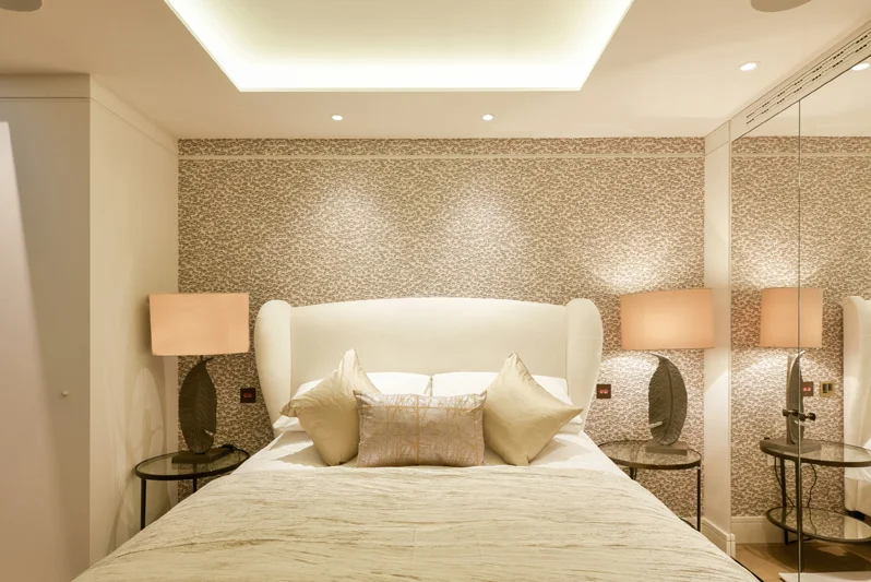 This luxurious bedroom uses warm neutral colours to create a boudoir level of comfort, with a feature wall to add some texture and great mirror placement.