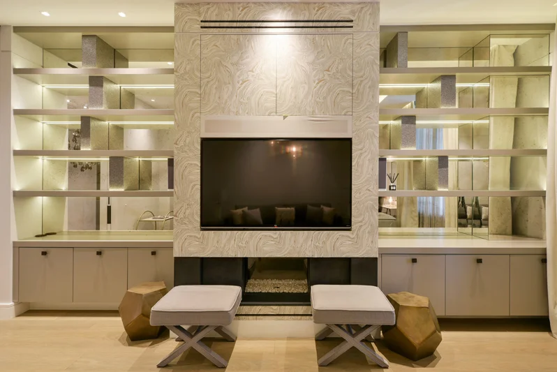 The fireplace is beautifully balanced and framed by in-built shelving.