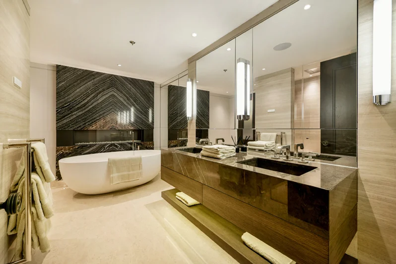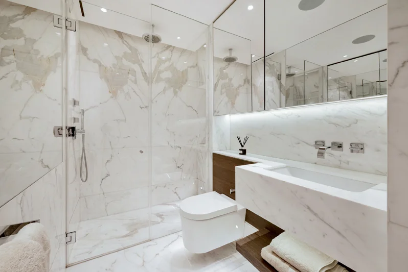 In a completely different style but just as immaculate is this second bathroom. Using a different type of very distinctive marble, the overall effect is of purity and serenity.