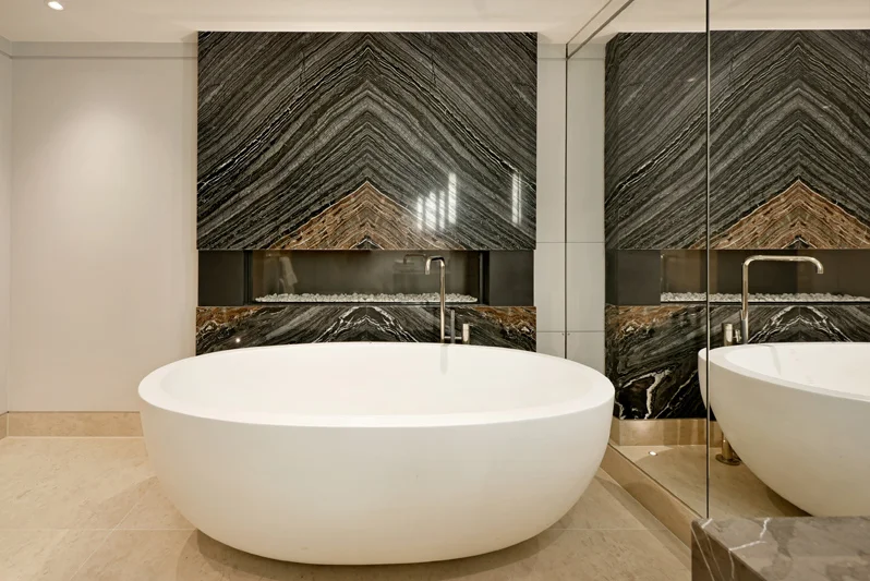 The use of this dramatic and striking marble gives this bathroom a focal point, even while it is countered by the serene smoothness of the bathtub before it.