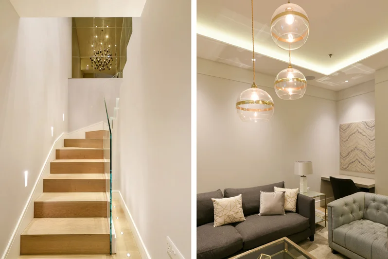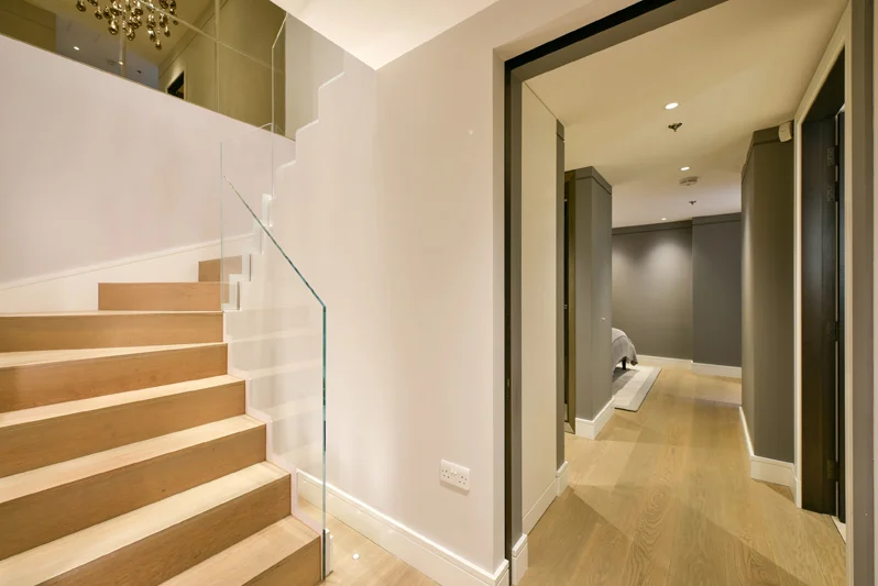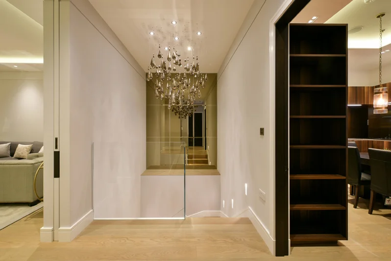 Communal spaces are not neglected: This landing features a dominant light fitting amplified by a full wall mirror but not distracted from with a glass banister which keeps the space as open as possible.