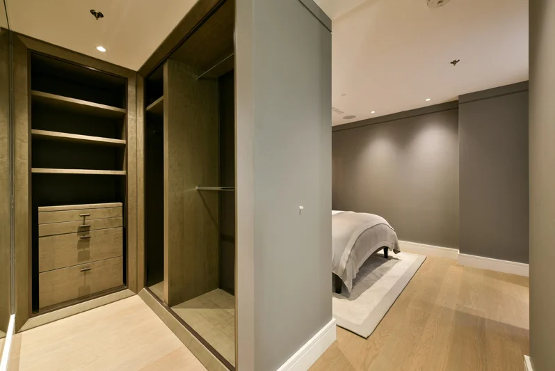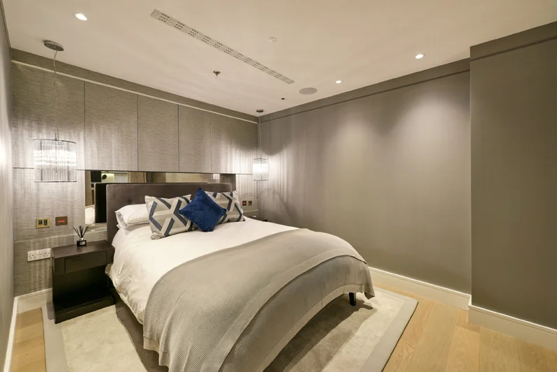 By contrast, the second bedroom opts for cooler, sophisticated grey tones.